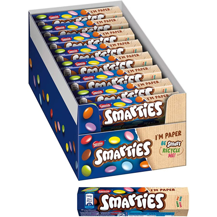 NESTLÉ SMARTIES, i famosissimi confetti colorati ripieni di cioccolato al latte. Un'esplosione di colori per decorare in maniera originale dolci, torte, gelati e scatenare la tua fantasia in cucina. La qualità del cioccolato Nestlé in otto colori differenti per una merenda gustosa e divertente