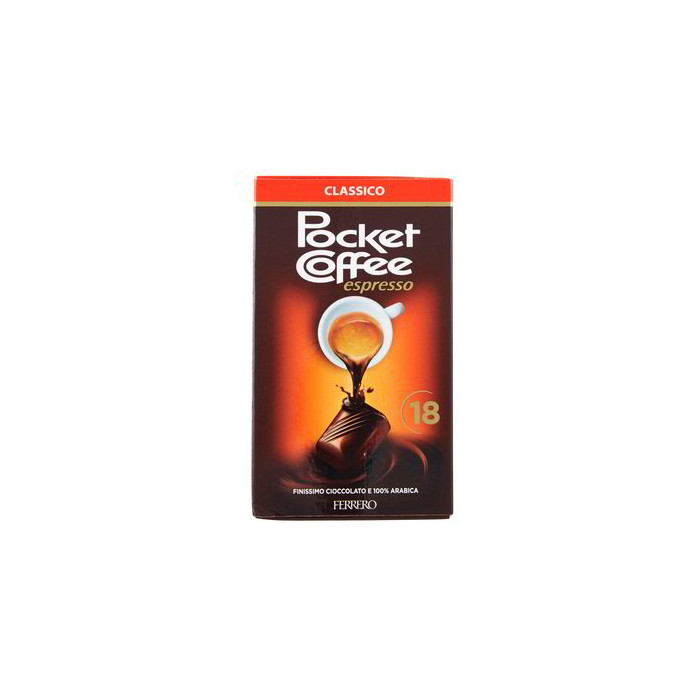 Pocket Coffee Espresso 100% Arabica. Tutto il gusto del caffe mescolato al cioccolato a portata di mano! Se non puoi farne a meno, non privartene! Confezione da 6pz da 18 pocket coffee cad.