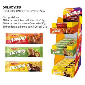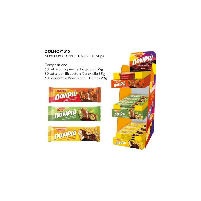 L'espositore Novi+ Comprende 90 Barrette : 30 Barrette Latte Con Biscotto E Caramello da 35gr , 30 Barrette Latte con ripieno di pistacchio da 35gr e 30 Barrette Fondente E Bianco Con Cinque Cereali da 28gr