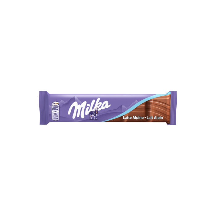 Latte Alpino, la barretta dal tenero ed inconfondibile gusto Milka, prodotta con 100% latte alpino. Il formato ideale per una pausa veloce e dal sapore irresistibile.