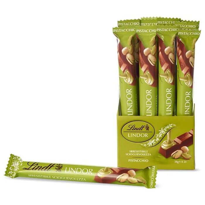Il Pistacchio E' Nella Top 3 Dei Gusti Preferiti Dagli Italiani. Lindor Snack Al Pistacchio Sono Barrette Da Un Guscio Di Goloso Cioccolato Al Latte Racchiuso da un Morbido Ripieno Al Pistacchio. Confezione da 24pz da 38gr cad.