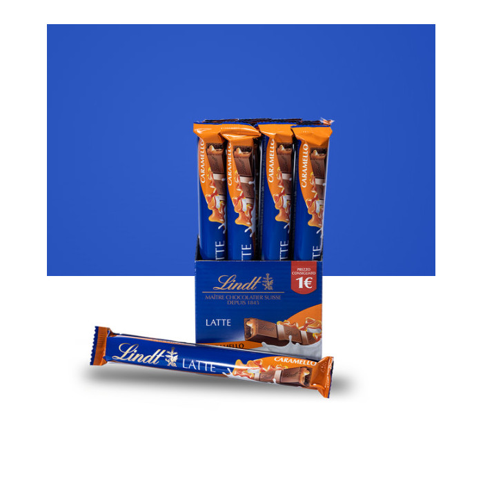 Delizioso cioccolato al latte con un morbido cuore al caramello. Stick Lindt Caramello racchiude 24 golosi stick da 38 grammi per un momento di golosità quando più ne hai bisogno.