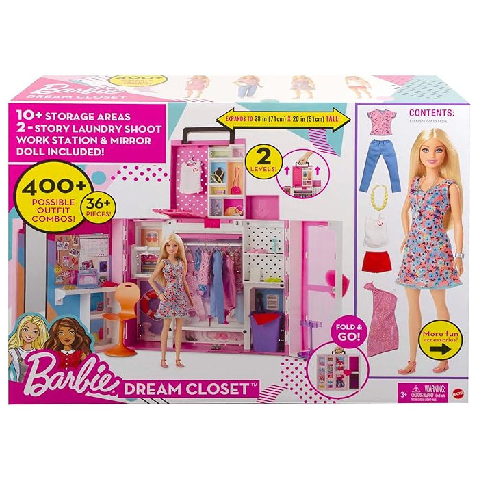 L'Armadio dei sogni di Barbie include una bambola Barbie e si apre per rivelare uno spazio gioco largo più di 60 cm, con oltre 15 punti per riporre gli accessori, un secondo piano con area appendiabiti a comparsa, una buchetta per la biancheria, uno specchio a figura intera, una scrivania e oltre 30 abiti e accessori.