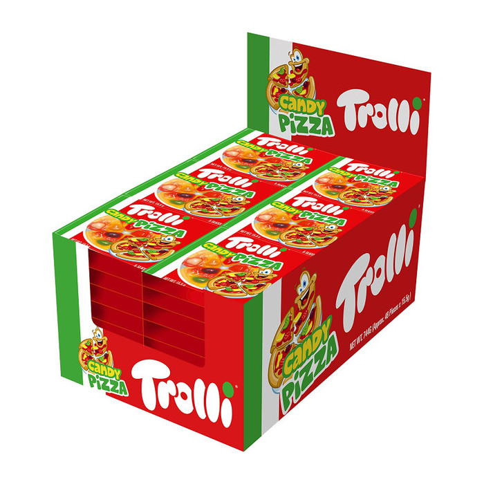 Caramelle gommose a forma di pizza incartate singolarmente. Barattolo da 1,25 Kg con 100 caramelle da 12,5 grammi.