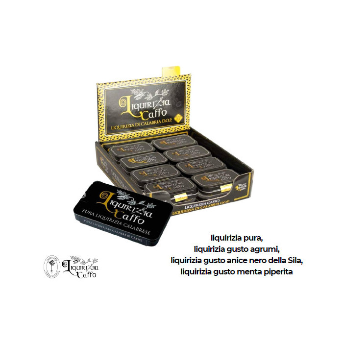 Tutti i procedimenti approvati da Caffo rispettano il disciplinare di produzione della liquirizia di Calabria D.O.P. e consentono l’ottenimento di un prodotto naturale di altissima qualità, che non contiene zuccheri aggiunti, coloranti o additivi. Expo da 24 scatole da 10 grammi cad.
