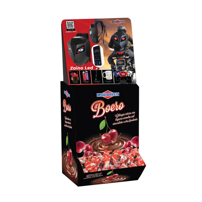 BOERI IN ESPOSITORE A BOCCA DI LUPO. CONTIENE: 350 VENDITE E 176 OMAGGI. MIGLIOR PREMIO: ZAINO LED Zaino super leggero con display, personalizzabile con testi, animazioni e immagini tramite l'app Loy Eyes. Realizzato con materiale 3D impermeabile, con molteplici scomparti e un ampia tasca per un laptop.