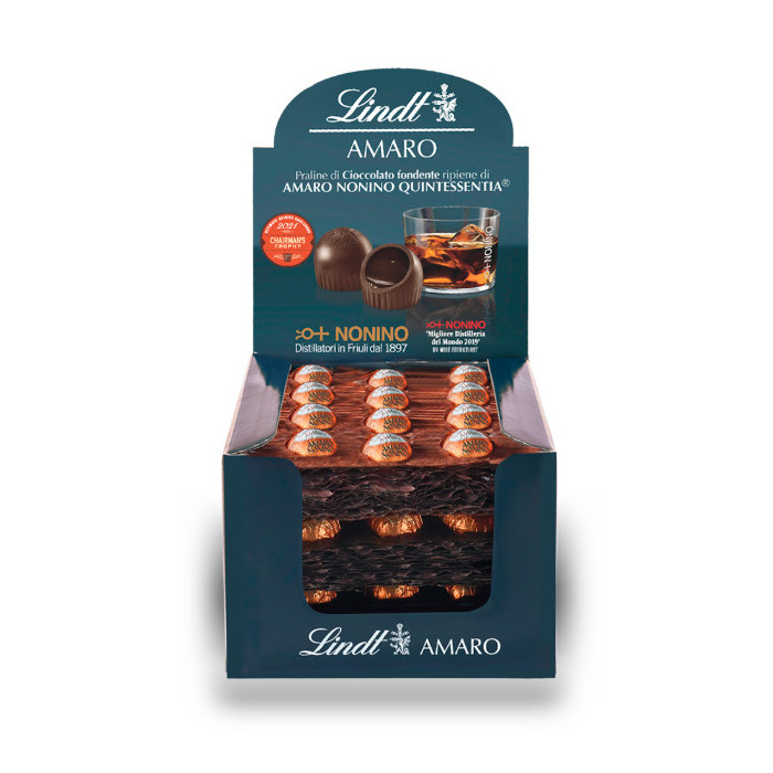 Il gusto deciso e intenso del nostro finissimo cioccolato Lindt si sposa con le note alcoliche dell'Amaro Nonino. Le praline Amaro Nonino hanno un guscio di finissimo cioccolato fondente che racchiude al suo interno tutto il gusto dell'Amaro Nonino Quintessentia.