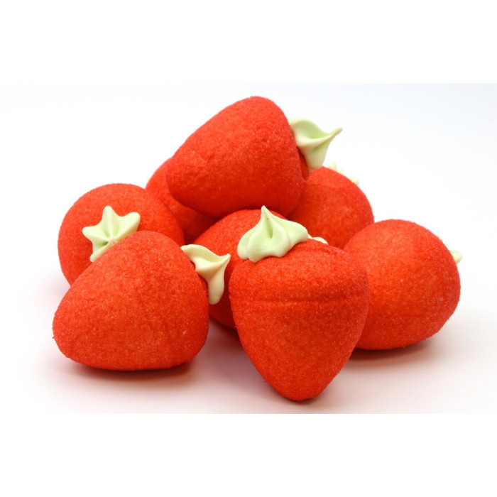Fragole giganti di marshmallow 18 g pz. In Vaschetta da 1,08 kg. Marshmallow a forma di fragola con foglia di zucchero. Gusto di fragola.