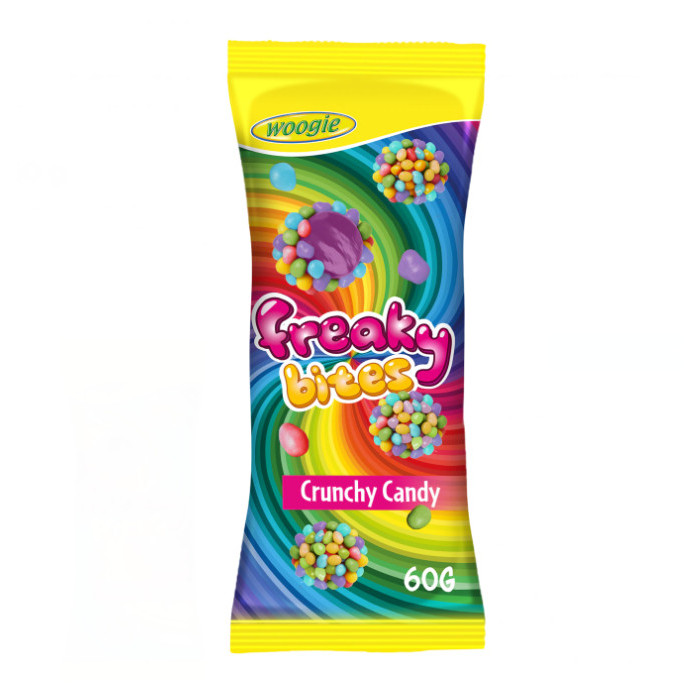 Freaky Bites – Fruttato. Vivace. Unico. Un vero piacere per gli occhi e per il palato: i Freaky Bites uniscono una morbida caramella gommosa alla fragola a un rivestimento croccante di perline di zucchero colorate. Perfetti da condividere o da gustare da soli – uno snack fruttato che mette subito il buonumore!