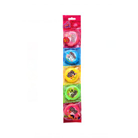 Rotoli di gomma da masticare 5 tipi da 18gr l'uno per un totale di 90gr a striscia.