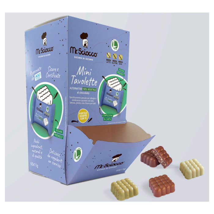 Dal gusto irresistibile di cacao con leggere note dolci e vanigliate, un’alternativa per chi non vuole rinunciare al piacere del cioccolato al latte. Le Mini Tavolette Mr.Sciocco sono completamente prive di tracce di lattosio, proteine del latte, glutine e soia, quindi adatte a persone con intolleranza al lattosio, allergia alle proteine del latte, sensibilità al glutine, o che seguono una dieta vegana.